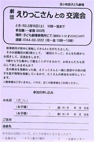 ![]() 札幌の劇団「えりっこさん」との交流 会をいたします。 ・令和2年2月15日(土)10時~昼まで ・一家族 300円 ・子ども劇場事務所(表町3-1-12) 0歳からでも集中して観ることができ る内容ですので、ぜひご参加ください。 |
