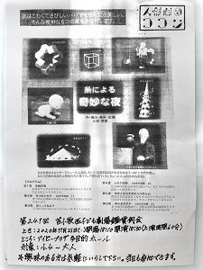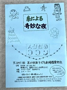 11月25日(水曜)小4以上対象の「糸による奇妙な夜」がアイビープラザであります。 担当ブロックは北光と東です。 ポスター、チラシが出来上がりました。 チラシは学校でクラス配布をしないので、私達が周りの人達にチラシで知らせていきましょう。 |