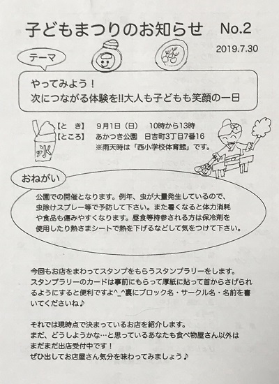 コロナの為大勢で集まることを避けるため、「あかつき公園での子ども祭り」は中止して、各ブロック単位でプチ子ども祭りかそれに代わる事をします。 残念ですが、コロナが収束するまでのもう少しの辛抱です。 |