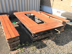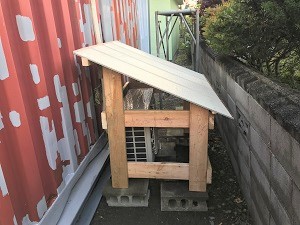 太田さんも来て、昼から雨も落ちつくとのことで、エアコン室外機の囲いを作成することに。