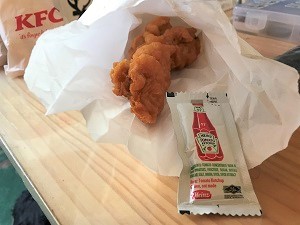 チキン3個(写真のは1個食べちゃった)とクリスピーとフライドポテトとナゲットで税込み 1,100円。